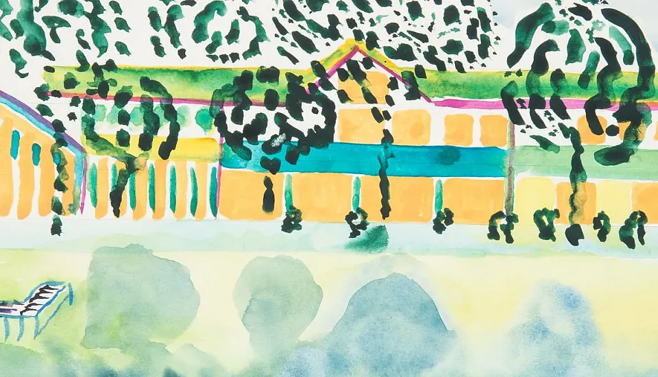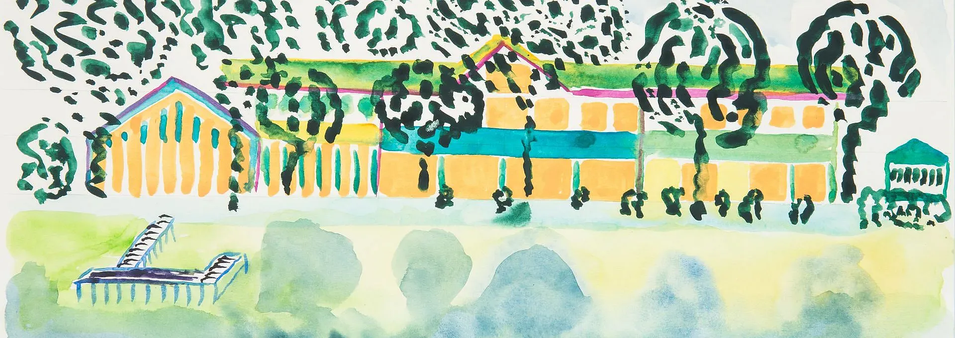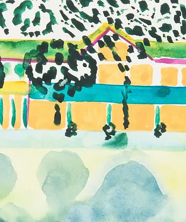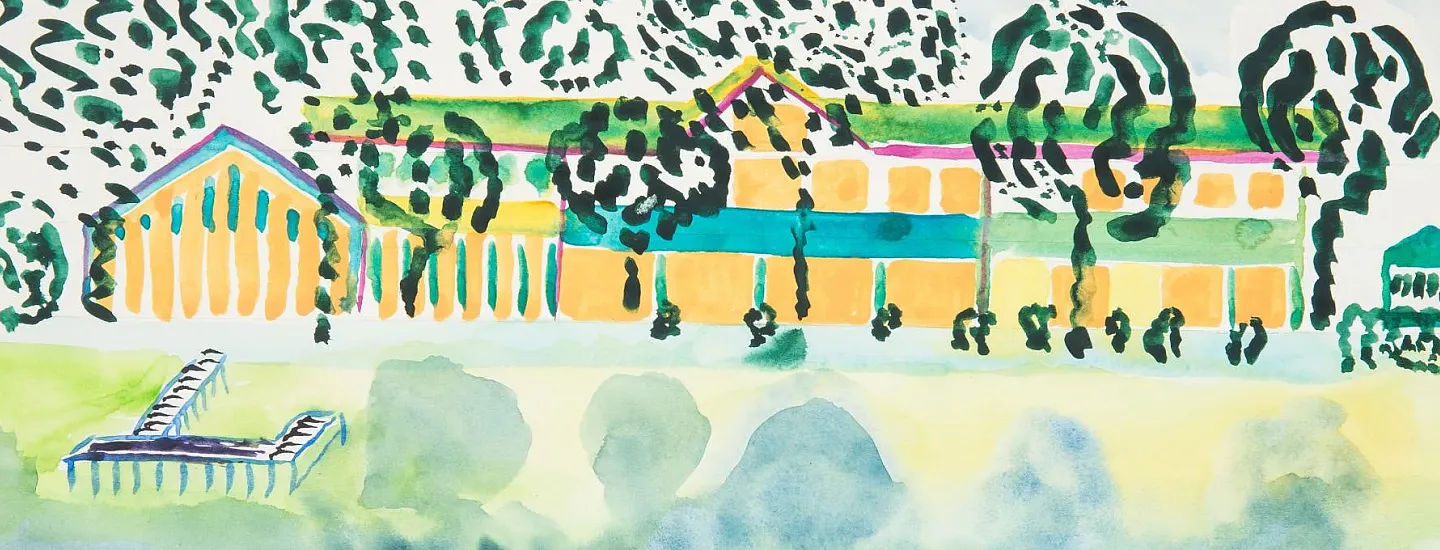 Zur Inspiration seiner Teams und als Leitmotiv für Architektur und Umgebung, malte Matteo Thun ein Aquarell, das den Spirit des Chiemgauhofs einfängt und wiedergibt. Leicht und spielerisch, mit wenigen Linien bringt er den Entwurf auf den Punkt. Es entstand nicht nur ein Gebäude, sondern ein Lebensgefühl: offene Strukturen, natürliche Materialien und der fließende Übergang zwischen Innen- und Außen.