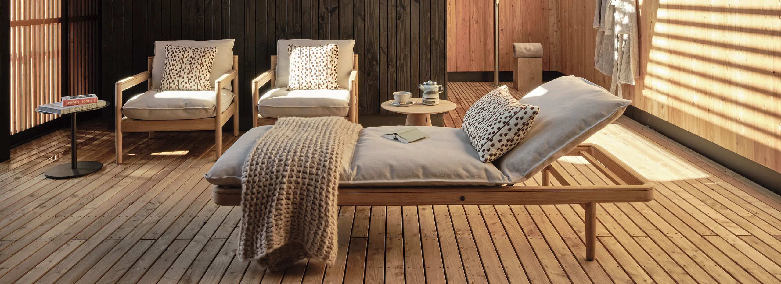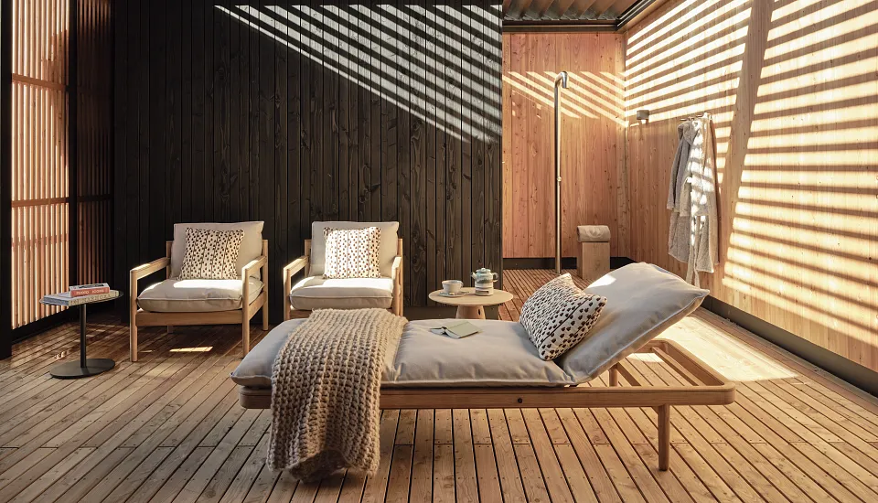 The Chiemsee Spa Suite is a true wellness paradise. It impresses with its spacious, fully furnished terrace with garden view and a private outdoor sauna and shower. Ideal for relaxing hours in absolute privacy. The larch wood bathtub in the bathroom is also a highlight.